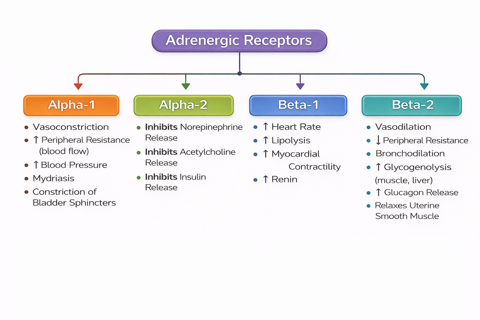 Adrenergic Receptors: Adrenergic receptors are located throughout the body, and when activated, they produce a wide variety of physiological responses. In the diagram below, you can see how the activation of any of the four adrenergic receptors will result in different responses. When these receptors are stimulated or blocked, they provide a balance with physiological responses, for example between vasoconstriction or vasodilation.