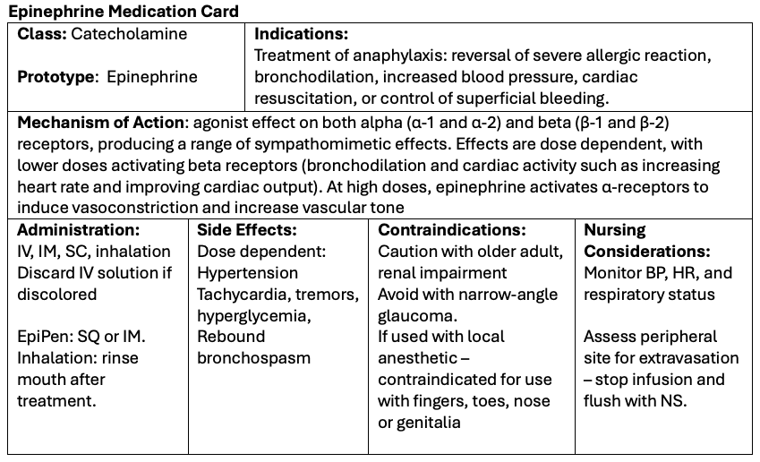 Epinephrine Medication Card