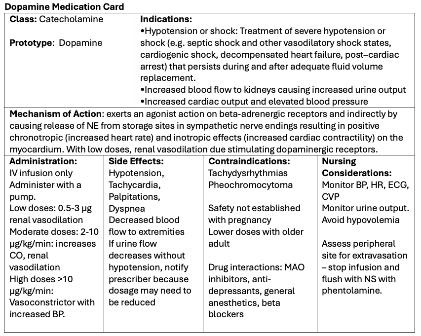 Now let’s take a closer look at the medication card for dopamine (Sonne, Goyal & Patel, 2025; UptoDate, 2021; Vallerand & Sanoski, 2021). Because information about medication is constantly changing, nurses should always consult evidence-based resources to review current recommendations before administering specific medication.