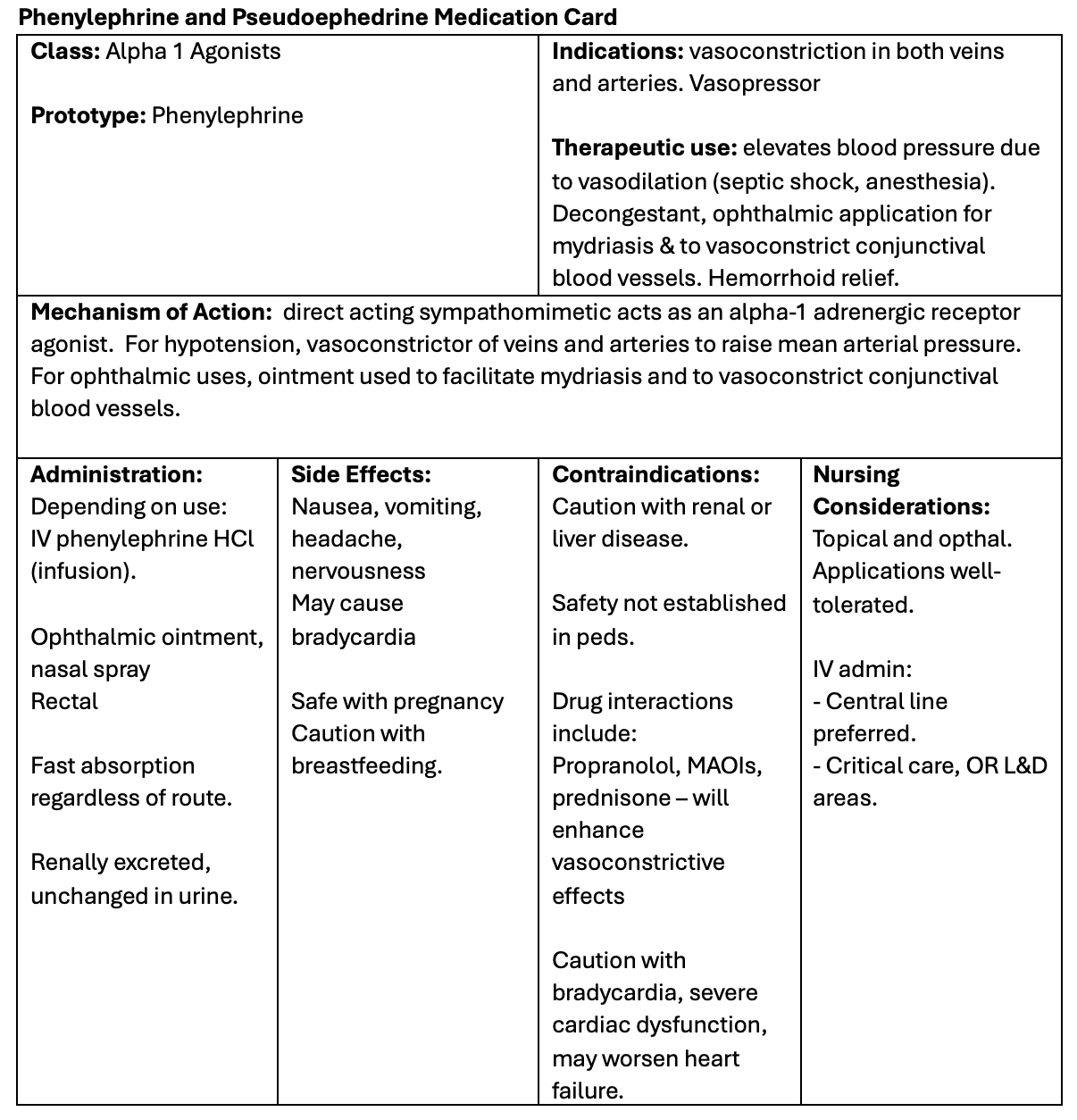 Phenylephrine Medication Card