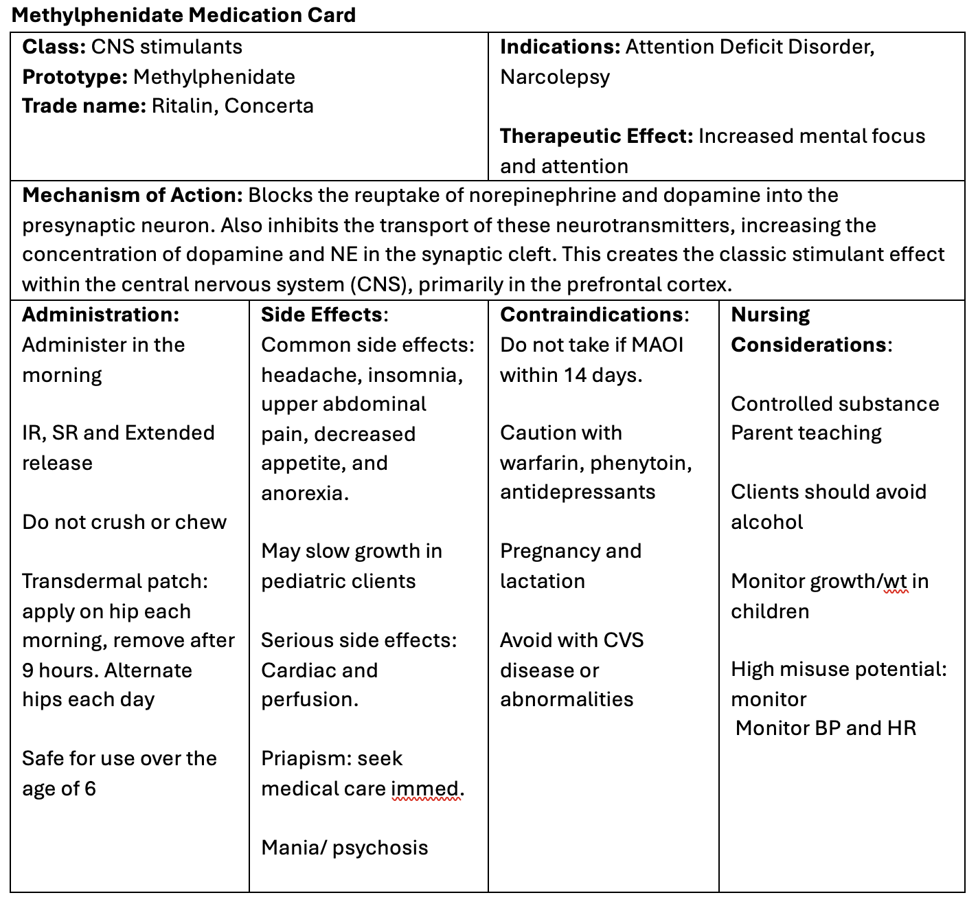 Now let’s take a closer look at the medication card for methylphenidate (Rosenjack Burchum & Rosenthal, 2019;Verghese, Patel & Abdijadid, 2024). Because information about medication is constantly changing, nurses should always consult evidence-based resources to review current recommendations before administering specific medication.