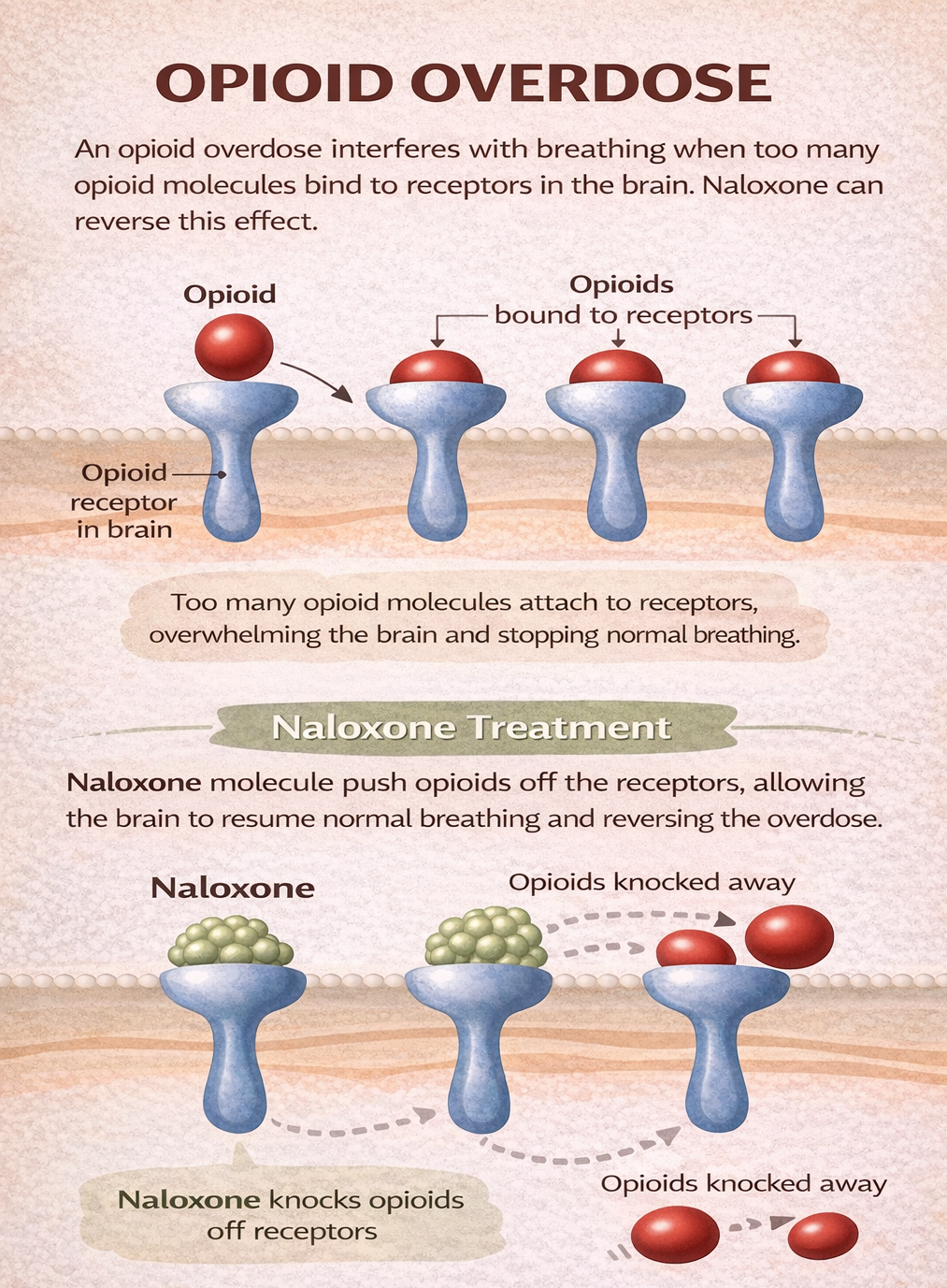 Figure 6.6e Opioid overdose. The action of naloxone in reversing the effects of opioid medications. Naloxone has a high affinity for the mu receptors, and in the presence of an opioid, will bind to available receptors as well as bump off opioid medications. This effect leads to an immediate effect of reversing respiratory depression. (Sheila O./TRU Open Press adapted from harmreduction.org)