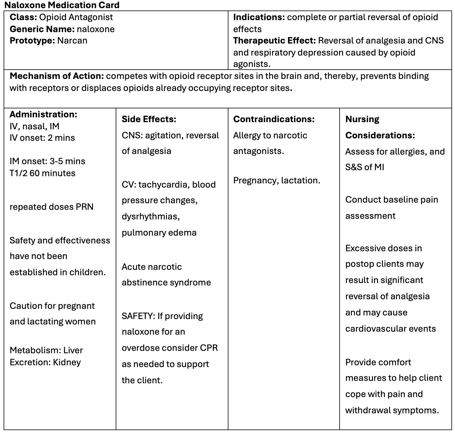 • IM: onset of action is 3-5 minutes, with t1/2 life 60-90 minutes. Since naloxone rapidly reverses opioid effects, the client will immediately experience withdrawal symptoms and no pain relief (Adams et al, 2019).