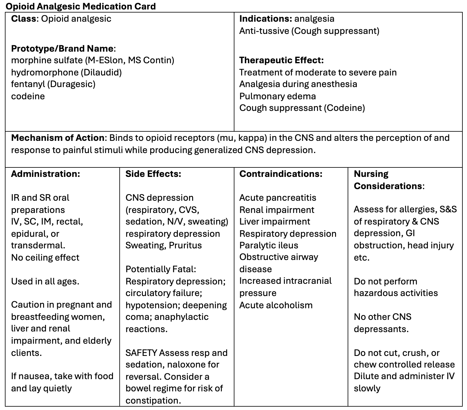 Now let’s take a closer look at the medication card for opioid analgesics (Rosenjack Burchum & Rosenthal, 2016;Vallerand & Sanoski, 2019). Medication cards like this are intended to assist students to learn key points about each medication. Because information about medication is constantly changing, nurses should always consult evidence-based resources to review current recommendations before administering specific medication. Basic information related to each class of medication is outlined below.