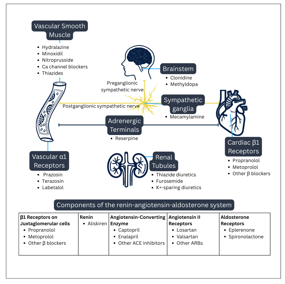 As mentioned above, there are 14 different classes of meds to lower blood pressure. Refer to the diagram below for all the sites of action of antihypertensives and the medications.