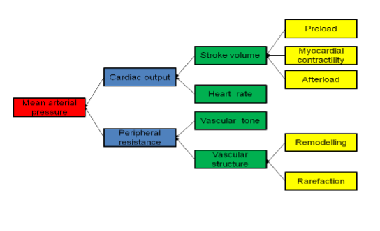 Arterial blood pressure (BP) = cardiac output (CO) x peripheral resistance.